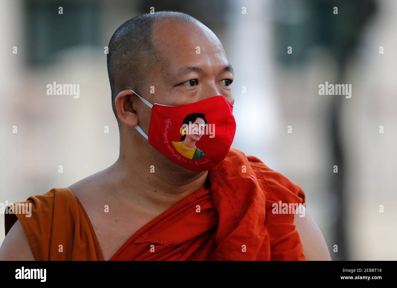 A Myanmar Buddhist Monk Wearing A Face Mask With A Picture Of Leader Aung San Suu